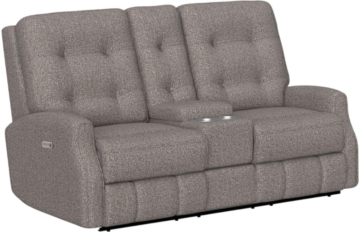 Indulge in the relaxing convenience of the fabric Devon power-headrest reclining loveseat with nailhead trim and a center console. Keep your refreshments at hand in the 2 cupholders, storage compartment, and storage drawer—do movie marathons right. With the powered recline and headrest features, you have endless opportunities to find your comfiest TV-watching position.