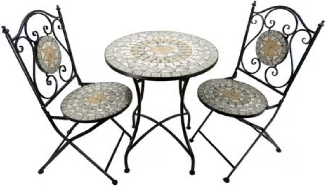 The 3-piece set includes a table and 2 folding chairs and is perfect for smaller outdoor spaces, like apartment balconies or studio apartment eating areas. Skillfully crafted from tough, long-lasting and weather-resistant iron and finished with a chic and sophisticated glass mosaic tabletop and seats. All 3 pieces are lightweight and the chairs are foldable, making them easy to pick up and transport to your preferred outdoor area for al fresco dining or enjoying your morning coffee indoors in your breakfast nook. They're also compact and easy to store when you're not using them. Simply wipe down with water and a mild soap or detergent to keep it looking brand new.