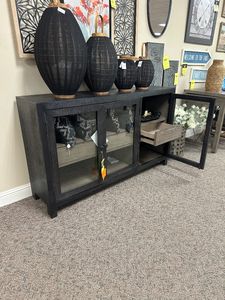 Add layers of form and function to your space with this accent cabinet. It's draped in a black finish on the outside and a warm gray finish inside, for a classic look that seamlessly transitions from casual to modern styles. This accent cabinet's flexible design includes three doors and two shelves for simple and streamlined storage.Read More